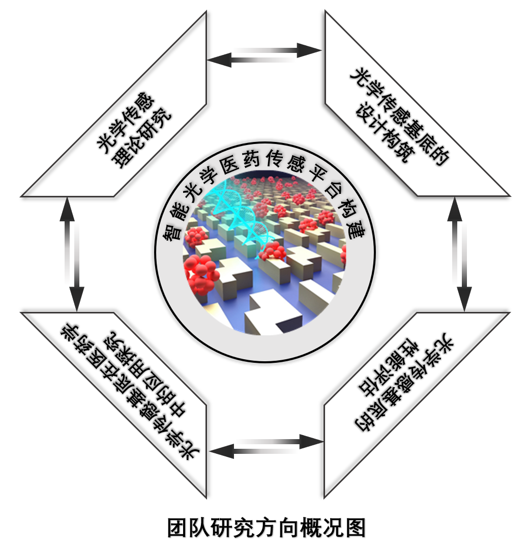 开展生物标志物及手性医药中间体的高效检测方法研究对诊断医学和新药研发有着重要意义。午夜av 作为省内重要的医药学研究中心,汇聚了包括医学、药学、化学及材料学等不同学科背景的优秀青年博士,有着天然的交叉合作优势。特别地,以团队带头人为代表的团队成员前期在传感原理、纳微结构设计与制备及医药分子信号处理等前沿领域积累了成熟的技术与丰富的经验,各成员之间优势互补,已具备合作开展上述高效医/药传感方法研究的条件。在此背景下,本团队围绕“智能光学医药传感平台构建”这一方向,依托午夜av 国家一流专业药学,及创新药物研发中心和医学研究中心,以应用需求为切入点,关注特征生物及手性医药中间体的高效检测,以构建高性能生物医药传感平台为目标,充分发挥团队人员前期获得的相关领域研究基础(近五年SCI中科院一区论文超过30篇),通过多学科交叉手段,系统开展智能光学传感平台构建及其生物医药应用研究。团队采取分工明确、密切沟通和优势互补的合作方式,各成员间共享实验室、实验试剂和学术资源,在科研、教学、学科建设和人才培养中相互合作,相互支持。团队研究方向概况如下图所示。